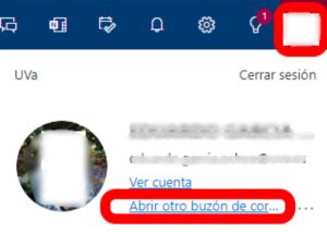 Una vez que hayamos accedido a nuestro buzón personal, localizamos en la esquina superior derecha de la pantalla el icono circular que muestra o nuestro avatar o nuestras iniciales y pulsamos en él, y después en la opción «Abrir otro buzón de correo».
