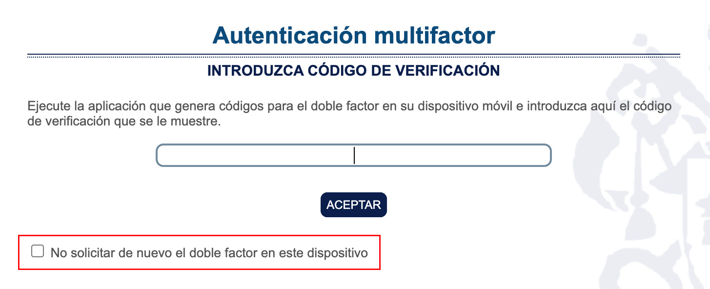 La pantalla de verificación incluye la opción “No solicitar de nuevo el doble factor en este dispositivo”. Si marcas esta casilla, tu navegador recordará la verificación y no se te pedirá el código de nuevo cada vez que accedas desde ese mismo dispositivo.