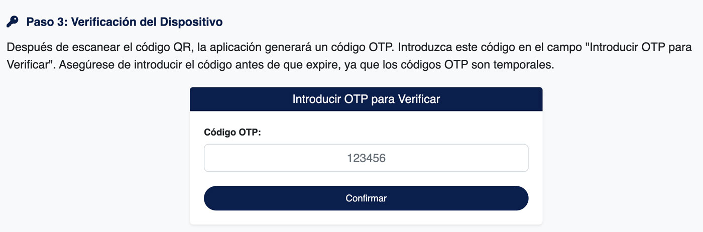 3. Para verificar la configuración de tu doble factor de autenticación en el dispositivo, introduce en la aplicación Configuración MFA, en el apartado Verificación del dispositivo, el código TOTP generado por la aplicación TOTP que acabas de configurar.